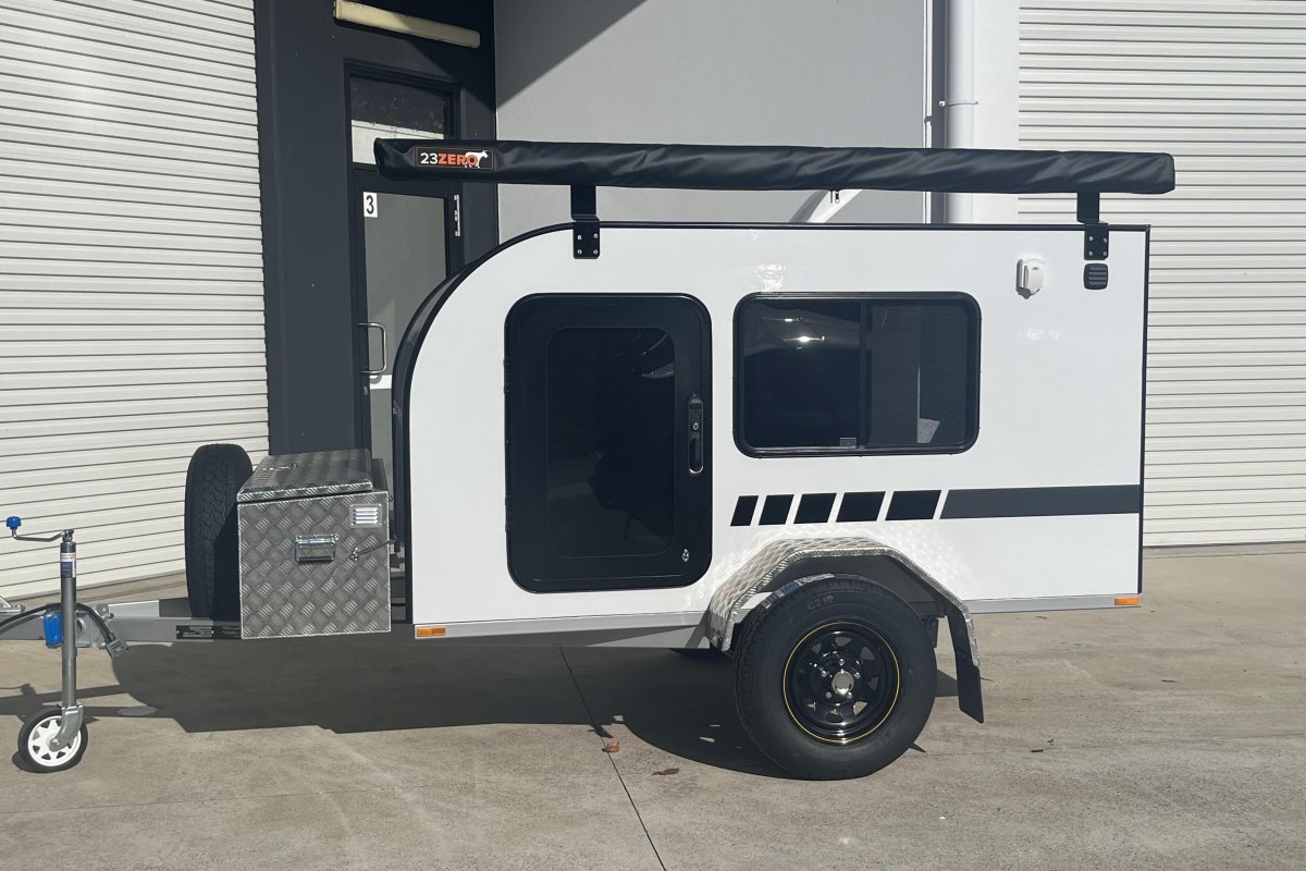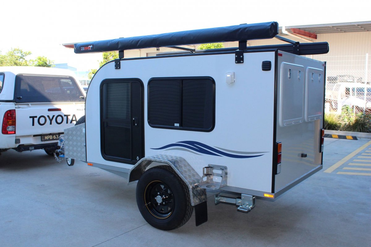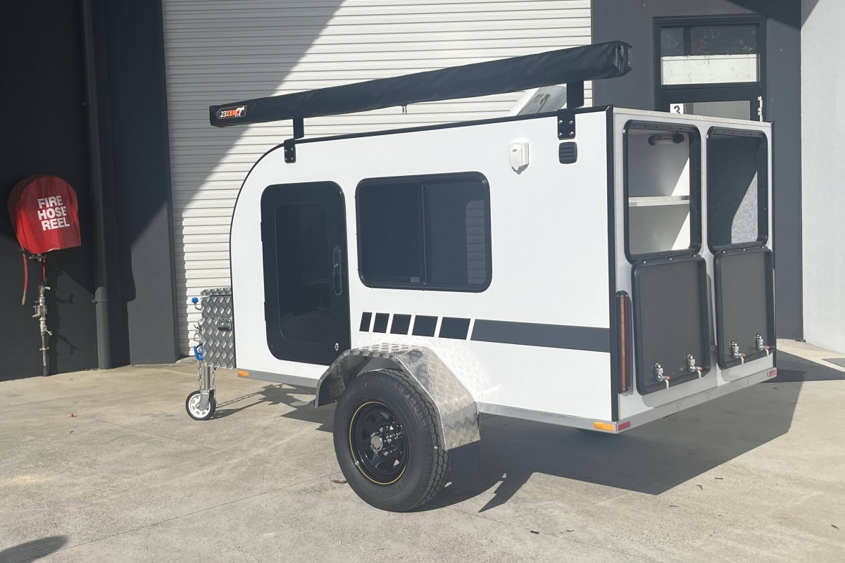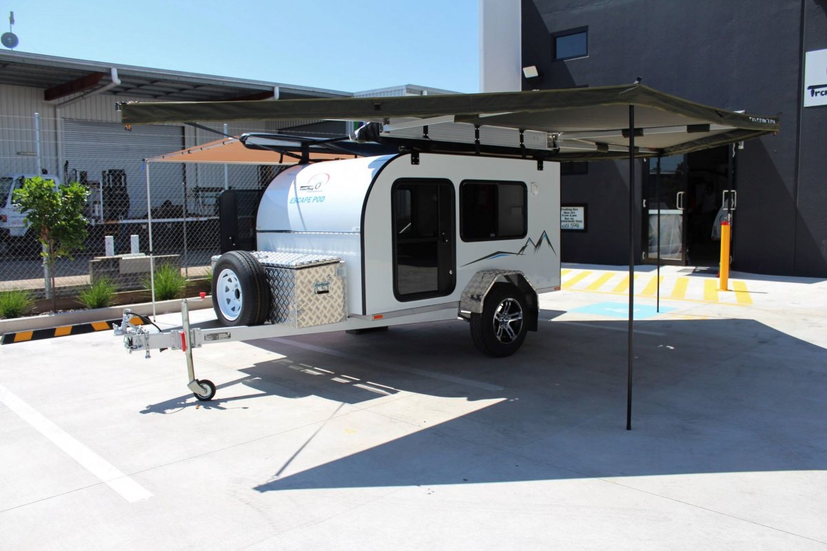 This unit comes standard with two doors, two windows and a 2.5m rollout awning on the passenger side, also standard is a spare wheel and an 8" flip-up jockey wheel. Get the Escape Pod DUO Travelbug Camper for Easy, Fun, Safe Camping.