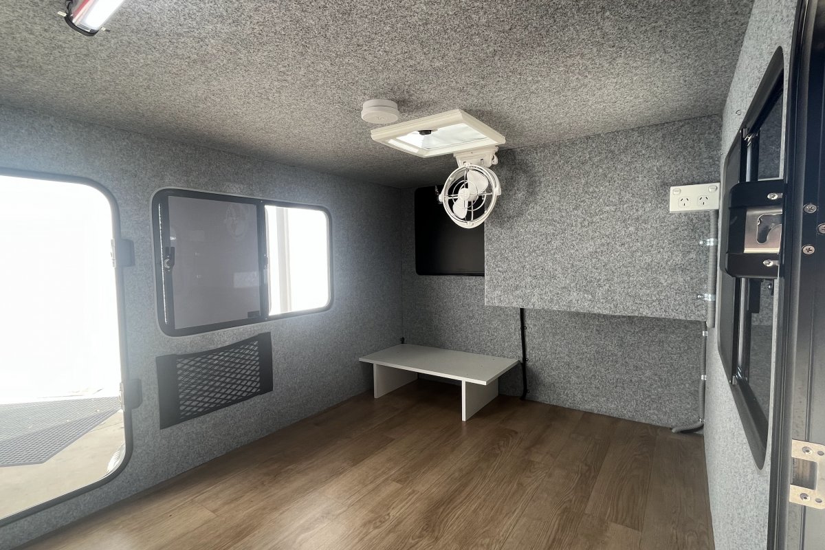 The chassis is built tough for on-road capabilities. Inside, there is ample lighting coupled to a 12-volt power system with a distribution box. Full carpet lining and roof vent with Sorrocco fan. The galley is an easy clean cupboard with a removable shelf. Tons of storage in the front toolbox. The fridge space holds up to a 45L fridge.
