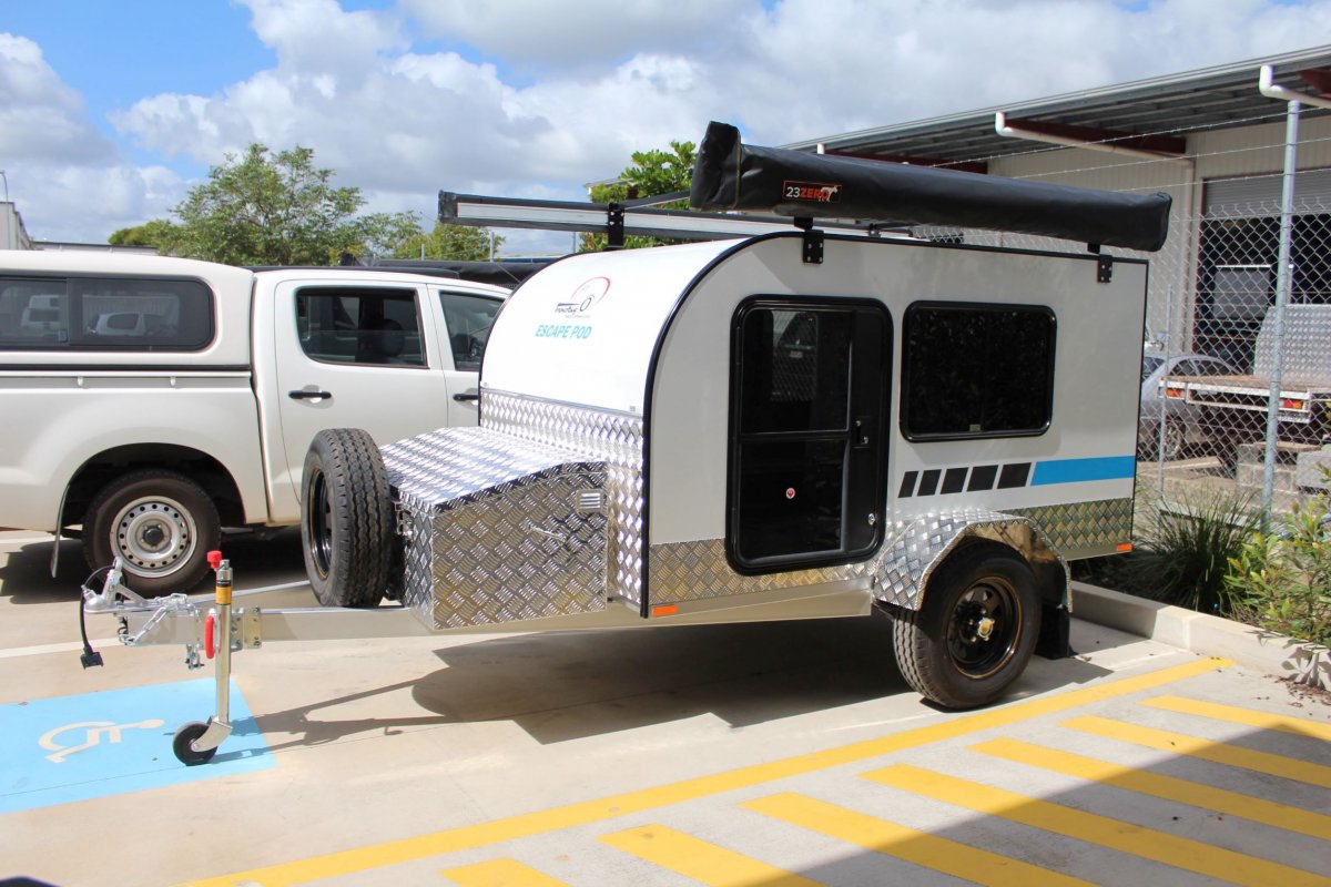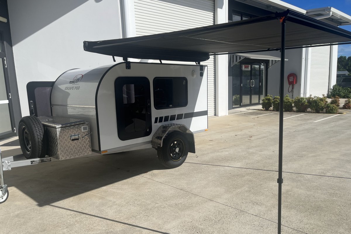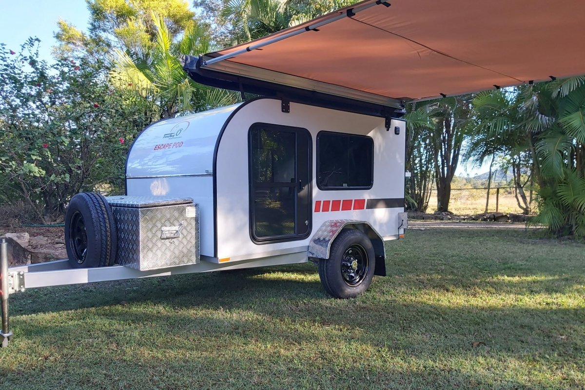 The Escape Pod DUO is our smart-style camper, all in an ergonomic compact design. Two safe doors, two large side windows, a galley pantry and two way fridge nook make this camper very desirable coupled with any awning combination.